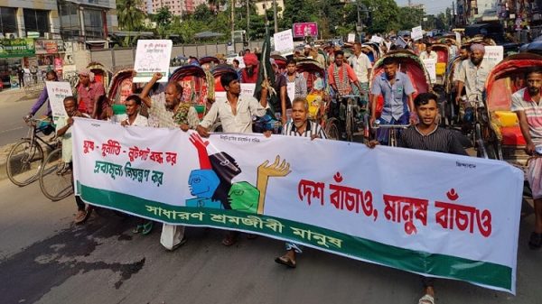 ঘুষ, দুর্নীতি ও লুটপাট বন্ধ করে দ্রব্যমূল্য নিয়ন্ত্রণের দাবিতে রাজধানীর নয়াপল্টনে বিক্ষোভ মিছিল করেছেন সাধারণ রিকশা শ্রমিকরা। শুক্রবার বিকেলে রাজধানীর আরামবাগ থেকে শুরু করে বিক্ষোভ মিছিলটি কাকরাইলের দিকে আসতে চাইলে